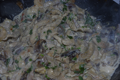 Ma ez a finomság volt nálunk ebédre. Ez a recept egy variáció a krémes pulykára mert szeretjük a "szószos húst". (Ezen a néven fut nálunk minden ilyesmi.) A jó ebben a receptben, hogy szabadon variálható milyen húsból készül, lehet csirkemell, pulykamell, nálam most épp csirkecombfilé, amit azért szeretek, mert nem olyan száraz, mint a mellehúsa. De készítettem már darált sonkából is, sőt hús nélkül is remekül megállja a helyét. Köretként lehet tésztával, vagy rizzsel enni.
