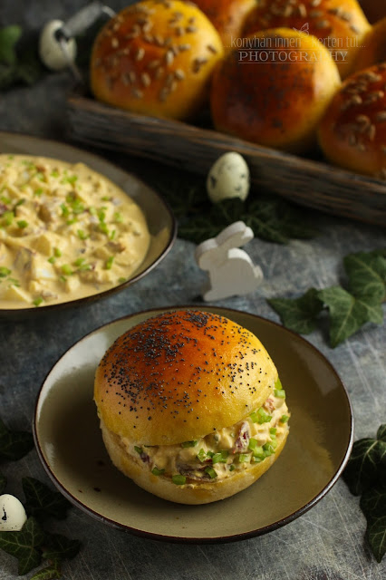 - Pihentetés után a cipókat lisztezett deszkán egyenként 30x30 cm-es négyzet formára nyújtjuk. Elosztjuk rajtuk a káposztát. Nem túl szorosan feltekerjük és sütőpapírral bélelt tepsibe egymás mellé fektetjük.