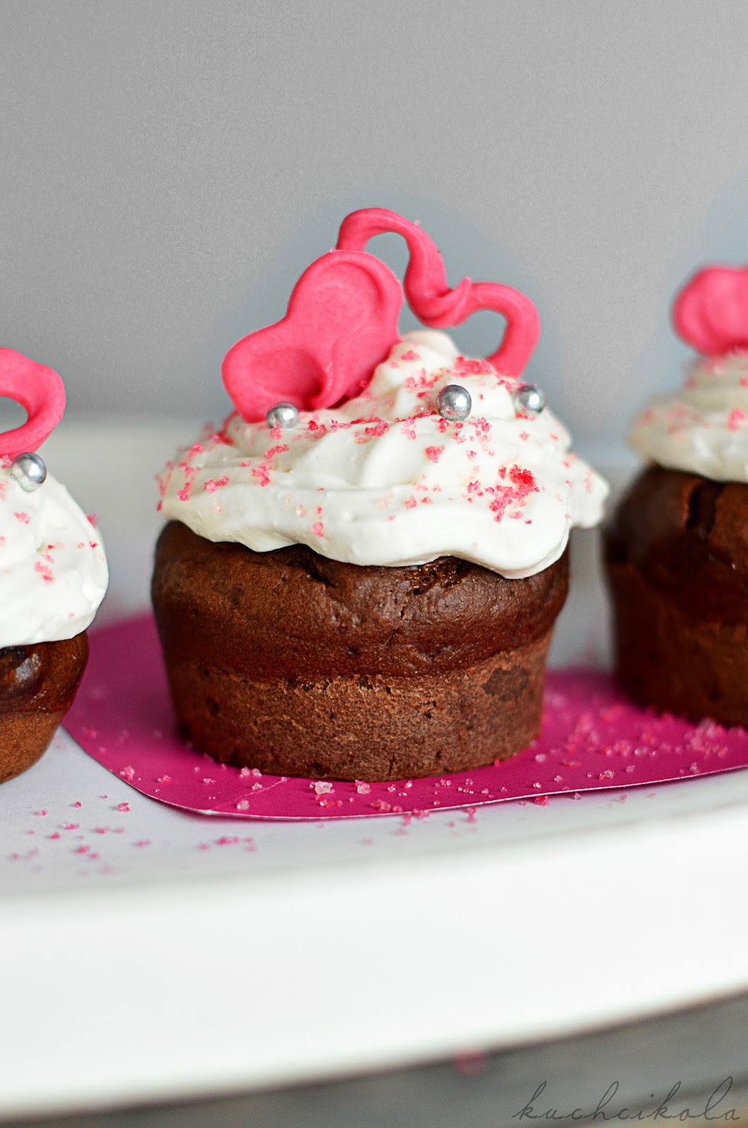 Długo zastanawiałam się, co przygotować na Walentynki. Zdecydowałam się na muffiny. Robi się je ekspresowo, wystarczy tylko przygotować serca z białej czekolady dzień wcześniej.