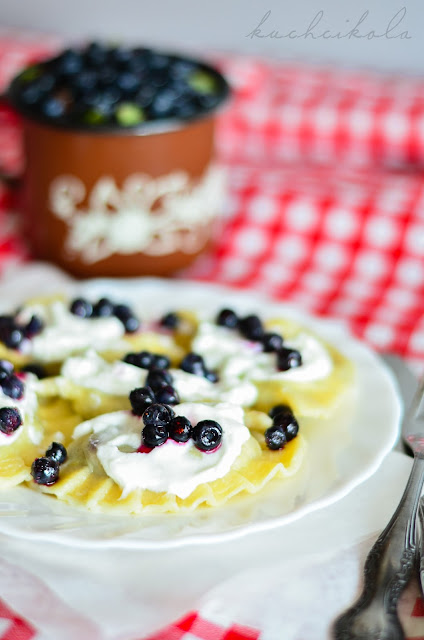 A co do tytułu posta... Właśnie kiedy tradycyjnie w niedzielę pojechałam do dziadków i zawiozłam im kawałek tego pysznego ciasta, dziadkowie po spróbowaniu myśleli, że jest to wypiek z jagodami :)