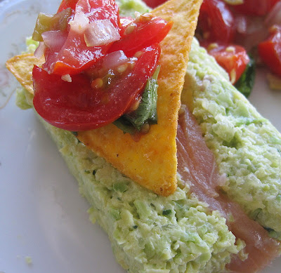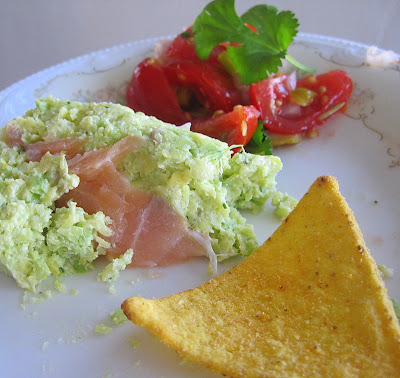 Kiedy terrina zastygnie,kroję ją ostrym nożem na plastry i podaję z salsą i tortilla chips.