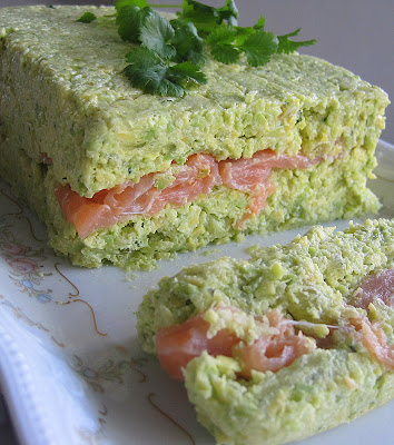 Formę na terrine wykładam folią spożywczą posmarowaną oliwą.Wykładam połowę masy,na niej układam plastry łososia.Przykrywam pozostałą masą.Wyrównuję.Przykrywam folią i pokrywką.Wstawiam do lodówki na kilka godzin,żeby masa dobrze zastygła.*
