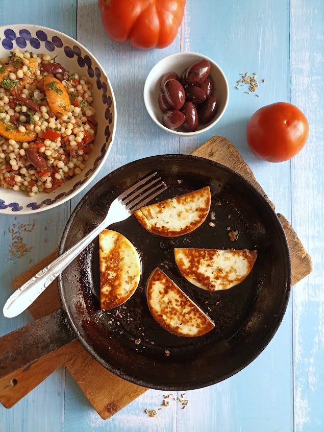 La prima ricetta che ho provato è un’insalata di couscous molto interessante per la compresenza di due diversi tipi di granuli: il cous cous classico e il mograbiah o cus cous gigante (sostituibile con la Fregola per noi). Il contrasto risulta molto piacevole all’assaggio e il condimento a base di pomodori cotti in forno fino ad asciugarli quasi completamente dona un sapore intenso e molto concentrato, ben bilanciato dalla freschezza del labneh.