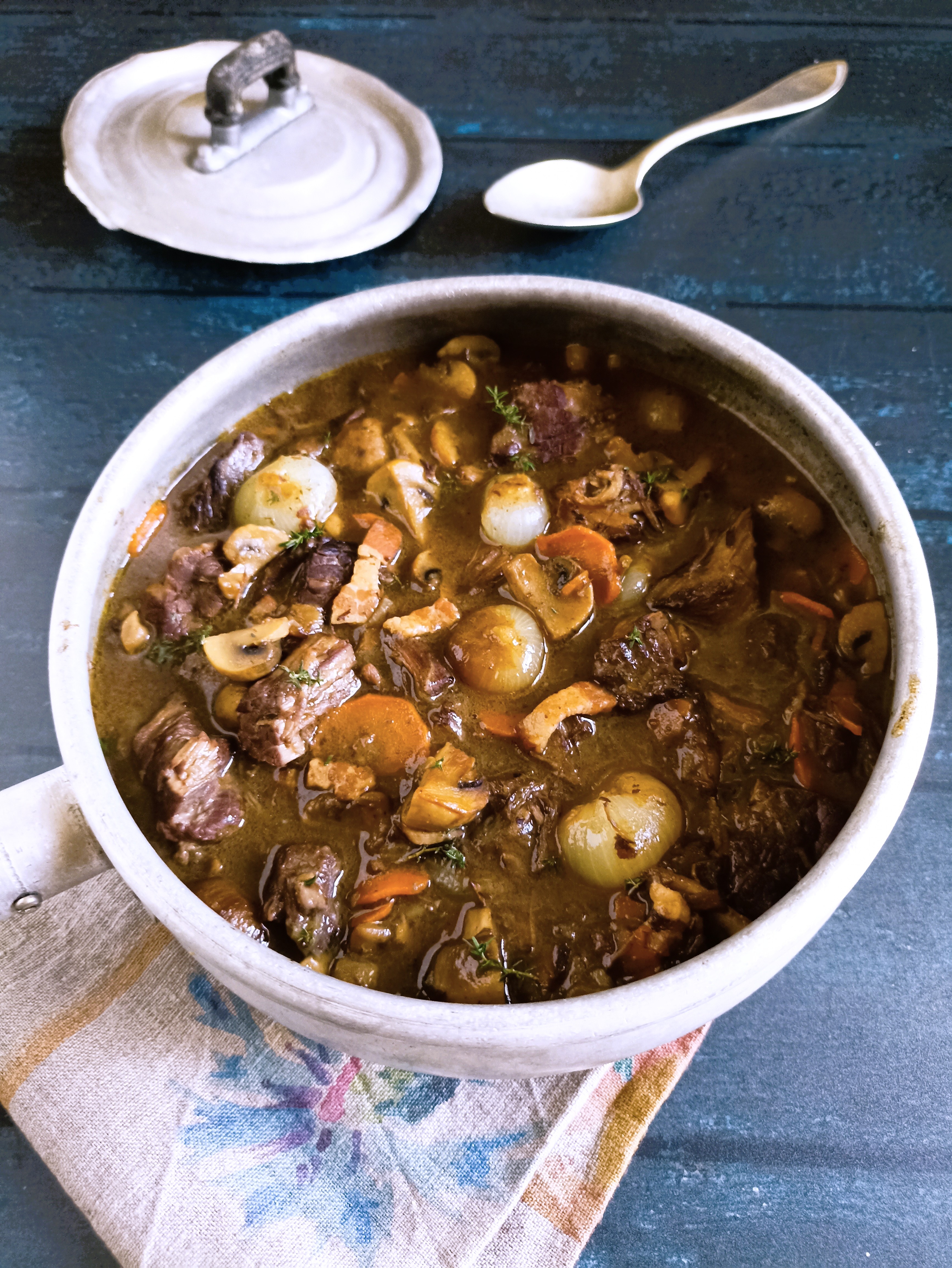 un grande classico della cucina francese, Il BOEUF BOURGUIGNON, dove la carne è sicuramente la protagonista assoluta insieme al vino rosso, corposo profumatissimo. Il tempo, il calore e il vino compiono la magia di trasformare tagli di carne secondari ricchi di cartilagini e tessuto connettivo, in una delizia morbida e saporita, con un sugo denso e vellutato che deve essere glorificato sopra una polenta fumante o un morbido purè.