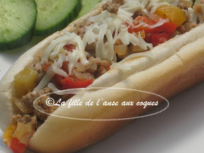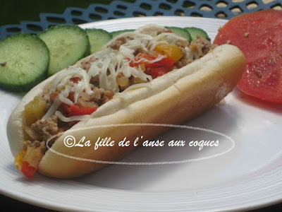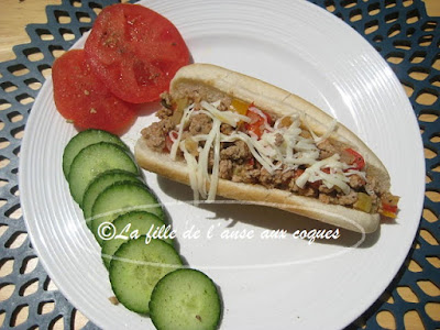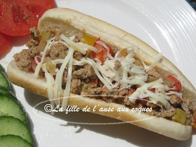 Cela faisait un bon moment que j'avais cuisiné du veau. J'essaie de profiter des spéciaux, mais la viande hachée qui nous est offerte à rabais est souvent faite d'un mélange de viande fraîche et surgelée. Dans ces moments là, il faut cuisiner cette viande la journée même, mais concrètement, ce n'est pas toujours possible. Ce n'est que récemment que j'ai pu en profiter. J'aime à varier les recettes et j'ai déniché ici ces pains fourrés qui me semblaient bien garnis et savoureux. J'ai modifié un peu la préparation et servi garni de fromage râpé. La préparation étant plutôt juteuse, mes pains à hot dog se sont vite détrempés avec la farce. On nous suggère comme alternative des pains tortillas, ce qui me semble plus adéquat . Ce pourrait être aussi des paninis qui ont une mie plus dense que les pains que j'ai utilisés. Ceci dit, la farce est vraiment excellente, et même détrempés, ces pains fourrés étaient très bons.