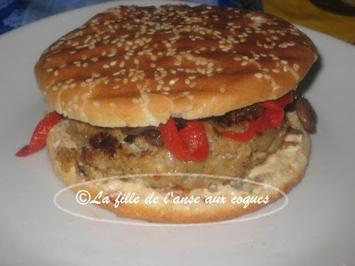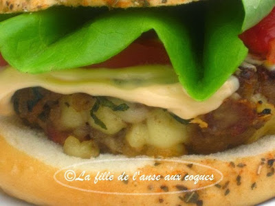 C'est sur le forum de Recettes du Québec que j'ai découvert cette belle recette de burger. La participante Bien voyons avait partagé la recette d'une vieille revue Coup de Pouce, et nous vantait son bon goût. Vous retrouverez la recette originale ici. J'ai fait la recette pratiquement à la lettre, sauf pour le choix du pain et pour la mayonnaise que j'ai rebaptisée sauce puisque j'y ai ajouté du yogourt pour l'alléger. D'ailleurs, cette sauce est à tomber, et donne le ton. Ce burger est très savoureux, et bien parfumé. Un gros coup de coeur! Vraiment délicieux!