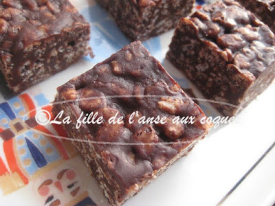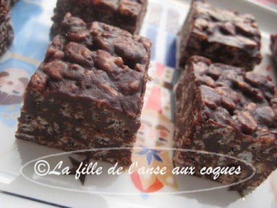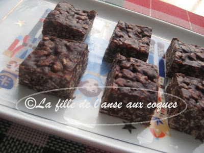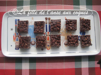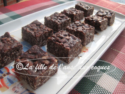 Dans le temps des fêtes, les carrés au Rice Krispies sont un incontournable dans ma famille. On adore ça, et particulièrement ma fille et ma petite-fille hihi. J'ai trouvé chez Le palais gourmand cette recette de carrés sans guimauve mais avec du chocolat. Comme j'apportais chez ma fille, j'ai privilégié du chocolat vegan qui ne contient pas de produit laitier. La préparation est sans difficulté et, à la dégustation, c'est vraiment très bon et différent de carrés à la guimauve. Ils ont été plus populaires chez les adultes que chez les enfants le soir du réveillon. Le rendement n'est pas mentionné, et j'ai fait de petits carrés, Je dirais entre 25 à 30 carrés, mais vous pouvez trancher plus gros bien sûr!