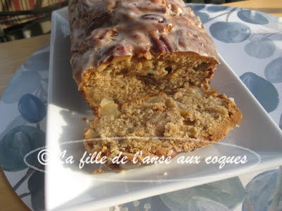Vous le savez, j'aime les desserts à base de fruits. C'est pourquoi, j'ai tout de suite été attirée par ce pain gâteau de Coup de Pouce déniché chez Wimzie. J'aimais les épices utilisées ainsi que la présence de sirop d'érable pour parfumer ce pain. Et cela regorgeait de pacanes! Mmmm! Ce pain gâteau avait tout pour me plaire. Aucune déception à la dégustation! Le glaçage n'est pas obligatoire, mais il est le petit plus qui fait la différence à mon avis. Généreusement garni de poires et de pacanes, il est du plaisir assuré en bouche. Ce pain aux poires est absolument délicieux.