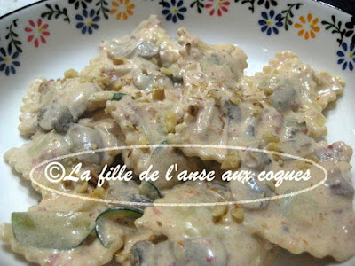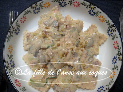 Ne me rappelais pas la dernière fois que j'avais cuisiné un plat avec des raviolis. J'ai vérifié et il semble que ce doit faire plusieurs années. J'ai trouvé ici ce qui me semblait prometteur comme plat de pâtes. On congelait avant la cuisson, ce que je n'ai pas fait, mais il est possible de procéder ainsi. J'ai laissé les étapes de cette partie de la recette pour ceux que cela intéresse. La préparation est vraiment simple. J'ai mis un peu plus de champignons que suggéré, et ajouté un peu de courgette. J'ai regretté de ne pas avoir mis du poivron rouge. Cela aurait mis un peu plus de couleur dans l'assiette, que j'ai trouvé en finale sans éclat. Le produit crémeux réduit en gras suggéré n'est plus sur le marché. J'ai utilisé de la crème 15% pour remplacer. De l'eau de cuisson est ajoutée pour la texture de la sauce. Je vous conseille d'en réserver un peu plus que ce qui est demandé pour ajuster la consistance, si vous jugez la sauce trop épaisse. C'est ce que j'ai fait. À la dégustation, les pâtes sont délicieuses. La sauce toute crémeuse au pesto de tomates séchées fait corps avec les raviolis. À refaire honnêtement! Et je crois que ce devrait être tout aussi bon avec des tortellinis.
