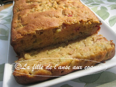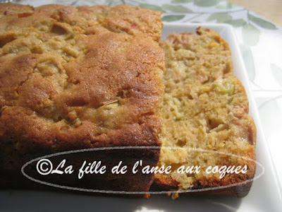Je me suis mise rapidement à la tâche, et suis allée à la cueillette de ma rhubarbe. On demandait 700 g de rhubarbe. Je ne réalisais pas la quantité que cela représentait, mais l'ai rapidement compris à mesure que je coupais: 6 tasses de rhubarbe que cela donnait, et c'est énorme. Un doute s'est installé dans mon esprit. C'est en faisant la préparation de la pâte que cela s'est concrétisé. J'ai décidé d'y aller graduellement pour intégrer la rhubarbe, et j'ai mis la moitié pour commencer. Honnêtement, je trouvais que cela faisait déjà vraiment beaucoup de rhubarbe, mais comme on demandait le double, j'ai risqué une tasse supplémentaire. Je me suis arrêtée là. La pâte était chargée de rhubarbe. Pas question d'en mettre davantage! J'ai enfourné, et j'ai dû mettre un peu plus de temps de cuisson que suggéré. C'est en tranchant plus tard le cake que j'ai compris que cette tasse de rhubarbe supplémentaire était de trop, et avait donné un cake un peu mouillé. Je n'ose imaginer ce que cela aurait donné si j'avais mis la quantité suggérée!