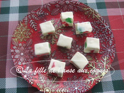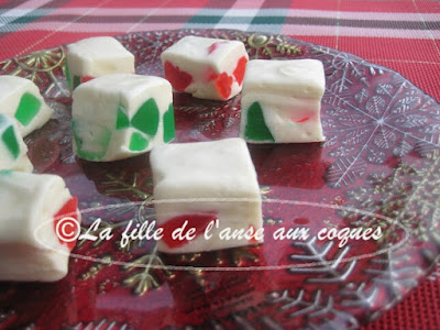 Cela fait quelques temps que je vois ces bonbons garnis de jujubes, et que je me dis que cela plairait aux enfants si j'en faisais l'essai. C'est avec la demande récente de ma petite-fille d'avoir sa propre boîte de confiseries que je me suis décidée. C'est ici que j'ai fait mon choix. La recette ne présentait aucune réelle difficulté et, jusqu'à ce que je me rende à l'étape de mettre dans le plat, les bonbons étaient pour ainsi dire terminés. C'est là que les choses se sont plutôt corsées. La préparation s'étirait à n'en plus finir. J'ai eu la mauvaise idée de me servir de mes mains, et cela collait à mes doigts bien évidemment. C'est avec l'aide de ma spatule en silicone bien beurrée ainsi que de mes doigts eux aussi bien beurrés que j'ai réussi tant bien que mal à étendre dans le plat la préparation. Un autre truc lu par la suite sur le site de l'auteur est d'utiliser un petit bout de papier parchemin beurré. Tout un travail mais j'ai réussi hihi. Je tenais à vous prévenir afin que vous vous prépariez hihi. Cela dit, ces bonbons sont un mélange de chocolat blanc et guimauves absolument délicieux Ma ptite cocotte qui adore le chocolat blanc sera séduite par ce doux mélange. Les jujubes viennent ajouter un côté festif à la friandise, et rendent ces bonbons vraiment jolis. On dirait des vitraux. Bien contente du résultat et j'espère que ma petite -fille et le reste de ma gang apprécieront.