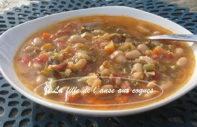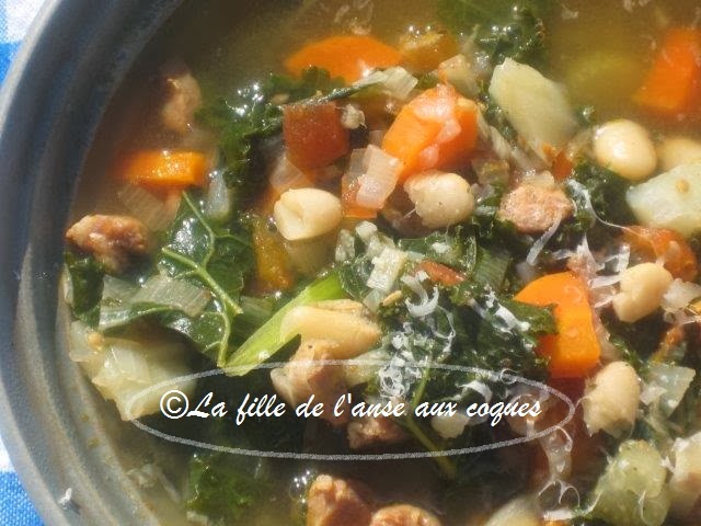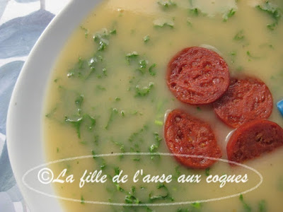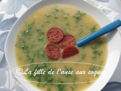 Nulle trace de légumineuse dans cette soupe. Et comme légumes, que des pommes de terre, de l'oignon, de l'ail et du chou frisé ou bien encore du chou Cavalier! C'est ici que j'ai finalement trouvé ce qui ressemble le plus à ce que j'ai vu sur YouTube et à l'émission L'Épicerie. Et c'est typiquement portugais. J'ai apporté quelques modification se référant à ce que j'avais vu et lu, puis voilà le résultat: une soupe toute en simplicité d'exécution. Le chorizo lui donne tout son parfum et son goût. Un vrai délice! La tradition portugaise veut qu'on serve cette soupe avec un verre de vin rouge, ce que je n'ai pas fait, mais si vous recevez, je pense bien qu'il sera apprécié. :-)