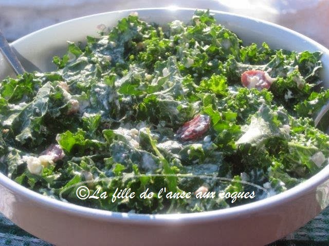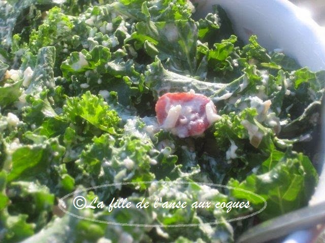 - 1 ¼ tasse (48 g) légèrement tassé de chou kale (ou du chou cavalier) (un peu plus de 2 feuilles) hachées en très fines lanières
