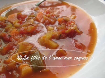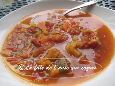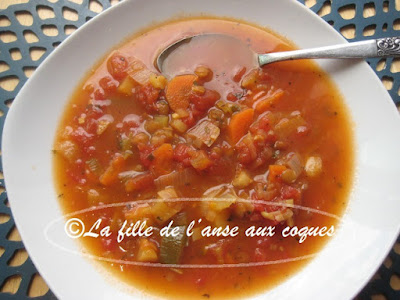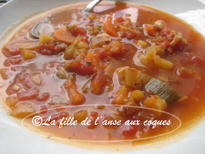 Je crois que la soupe aux légumes, avec celle au poulet et nouilles, sont les soupes les plus réconfortantes qui soient. Je ne suis pas au maximum de ma forme depuis un bon moment, et la soupe au quotidien me fait du bien. C'est ici que j'ai trouvé mon inspiration pour me concocter une soupe bien savoureuse et remplie de bons légumes. J'adorais l'idée d'un simple ingrédient ajouté au bouillon de bœuf, et qui pouvait faire la différence. De la sauce chili! Bien oui! Je ne me suis pas trompée. Sérieusement, j'aurais pu en mettre un petit peu plus hihi. C'est la petite touche supplémentaire, le oumf en fait, et c'est vraiment bon! Goûtez, et ajoutez davantage si vous le jugez nécessaire. J'avais un petit reste de tomates cerises un peu ratatinées que j'ai voulu passer dans cette soupe. Ce n'est définitivement pas essentiel, mais si vous avez, cela donnera une petite touche tomatée intéressante qui viendra appuyer le goût de la sauce chili. Cette soupe est vraiment délicieuse.