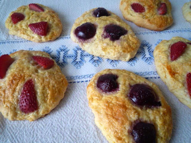 Quan hagin augmentat el seu volum, pintar cada coca amb clara batuda i posar-hi maduixes tallades o cireres sense el pinyol. Empolsinar amb una mica de sucre.