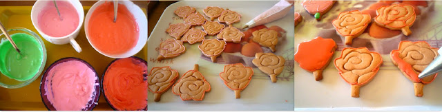 Abans de decorar les galetes, convé tenir tota la glassa tenyida i a punt. Com podeu veure jo vaig preparar-ne de rosa i de vermella amb les dues consistències, i una de verda de mitja densitat.