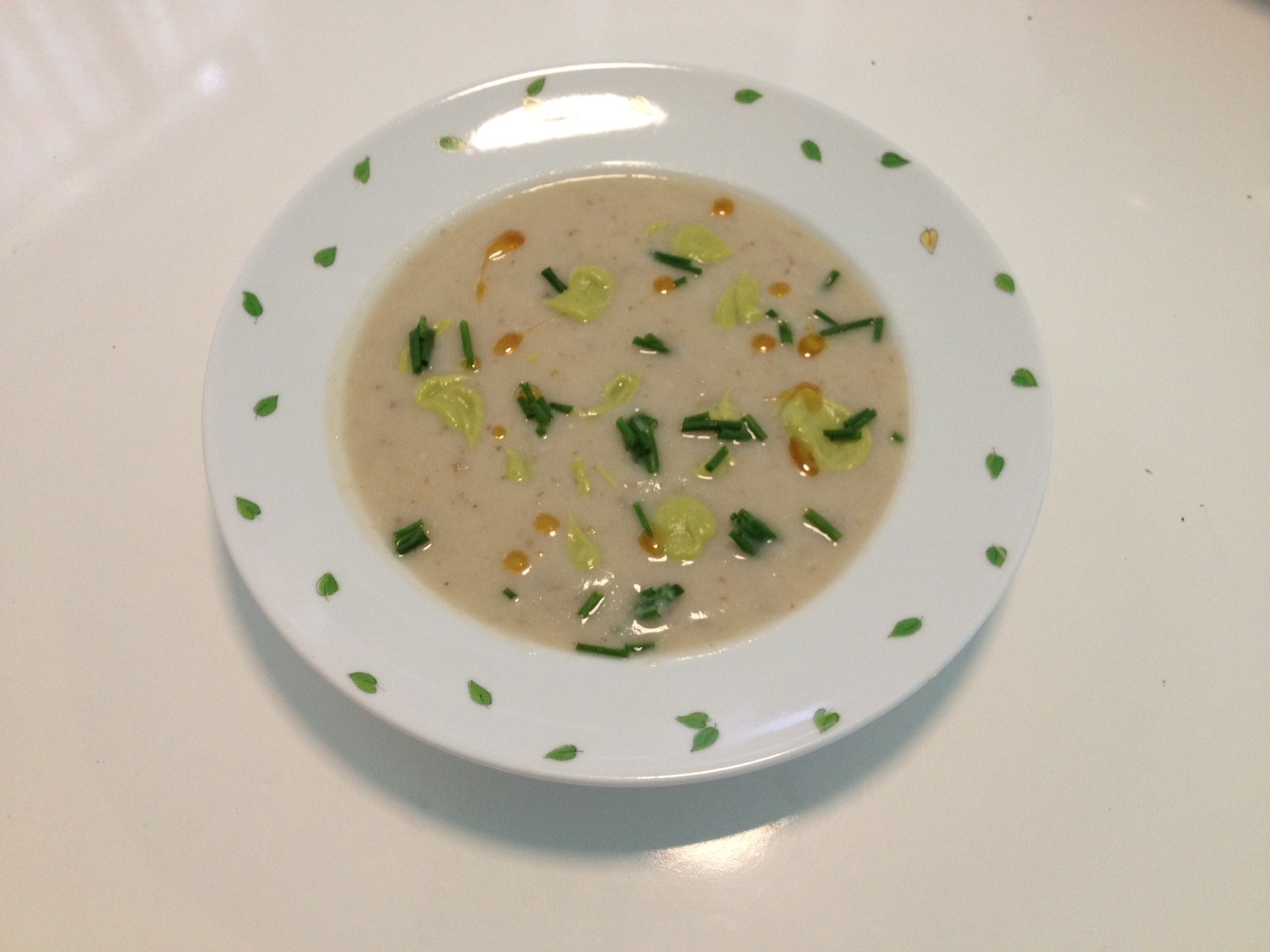 Top soup with dollops of fava bean purée, chives and bit of sesame oil