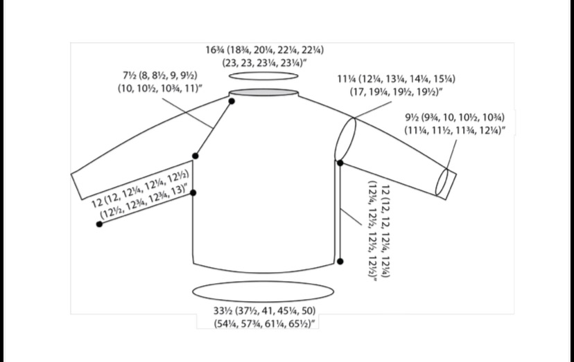 Lavora 88 (100, 108, 120, 130) (140, 148, 158, 170) maglie davanti Metti in sospeso 56 (62, 66, 72, 74) (82, 92, 94, 94) maglie della manica Avvia 8 (8, 10, 10, 14) (16, 18, 18, 18) maglie sotto il braccio Lavora 88 (100, 108, 120, 130) (140, 148, 158, 170) maglie dietro Metti in sospeso le successive maglie della seconda manica Avvia di nuovo le maglie sotto il braccio