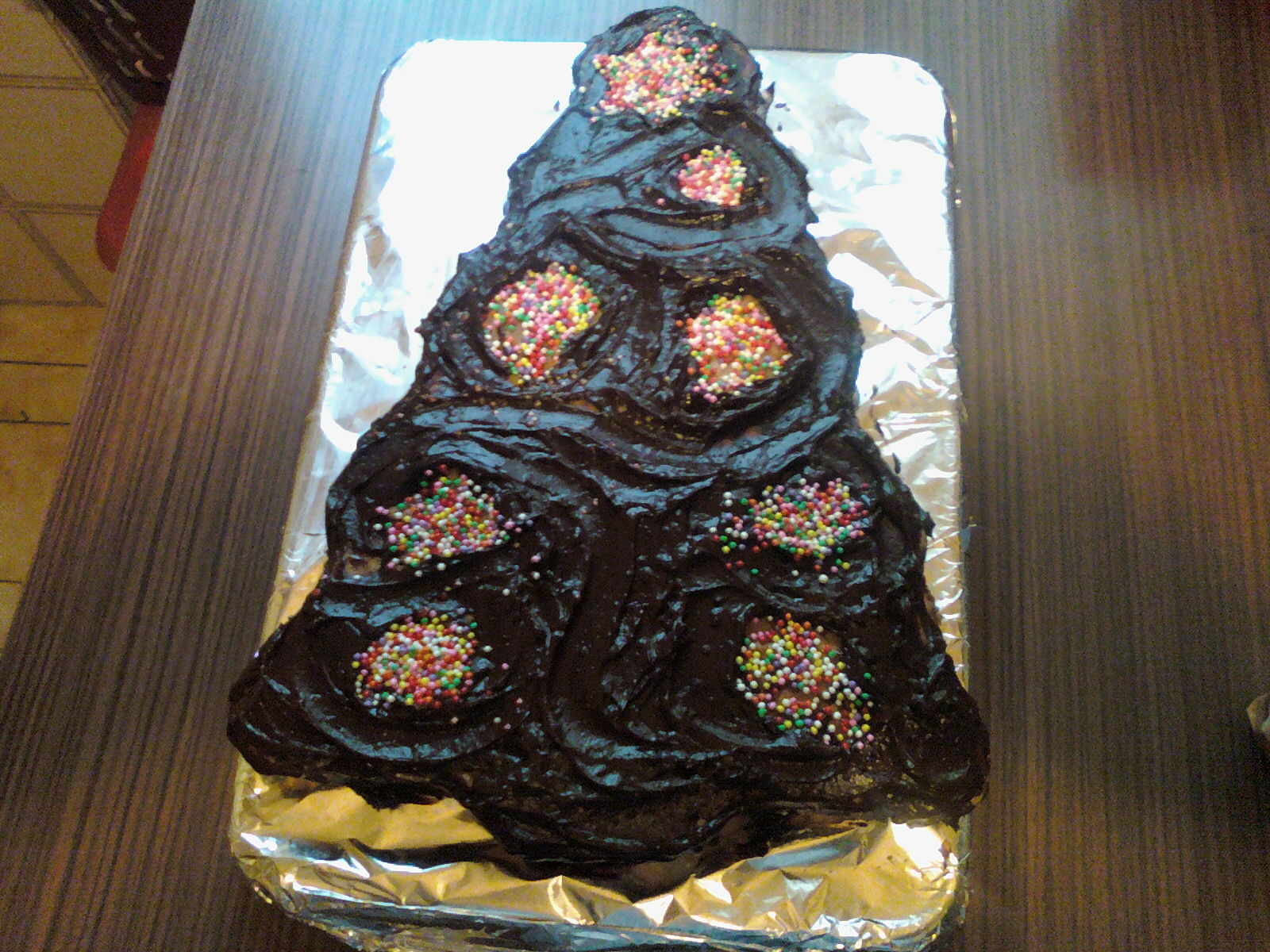 Albero di Natale, pan di spagna farcito con crema pasticcera e ricoperto di cioccolato fondente, decorato con palline colorate, una goduria!!!!