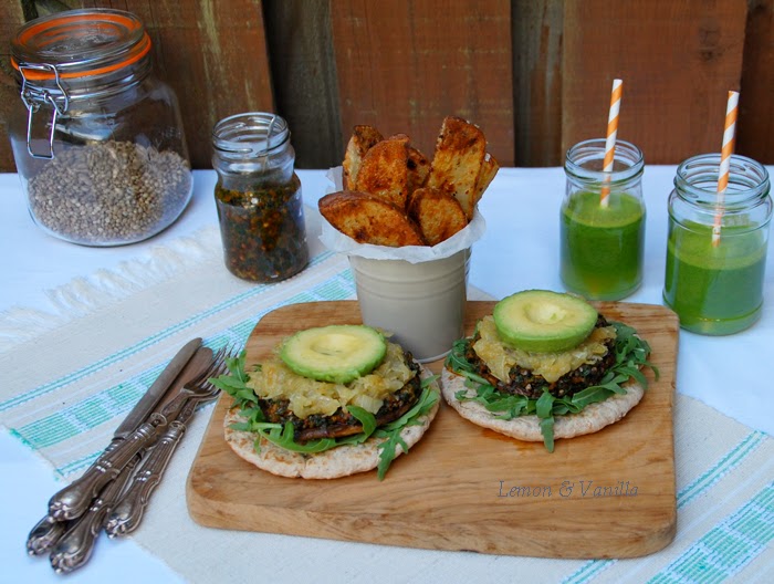 Serve the sandwiches with the crispy potato wedges and the green juice.