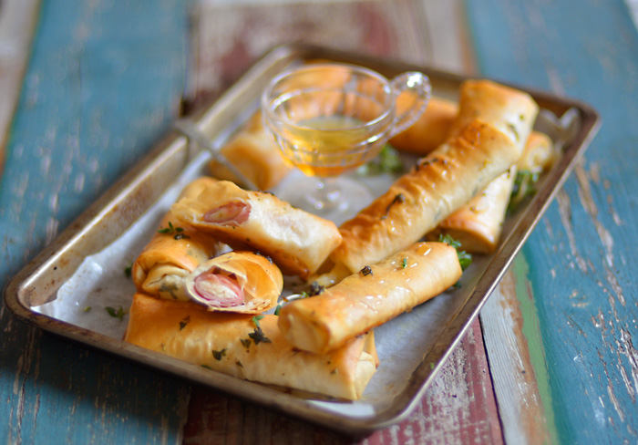 Repetir o processo com a restante massa filo, manteiga derretida e rolinhos de fiambre, até terminar todos os ingredientes e os 12 rolinhos estiverem montados.
