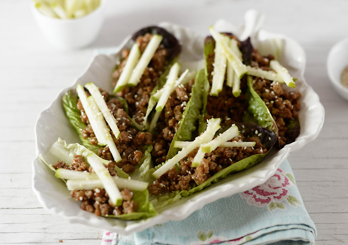 Remove the pan from the heat and serve the mince mixture over the lettuce leaves, topped with the apple and the sesame seeds.