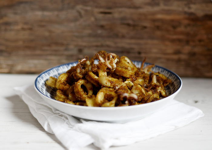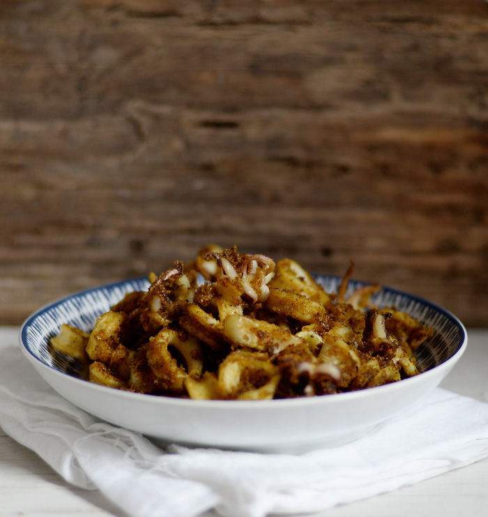Add the squid and toss the flour and spices lightly over it without excessively handling the squid itself, as otherwise you will create a paste when the flour combines with the juice of the squid.