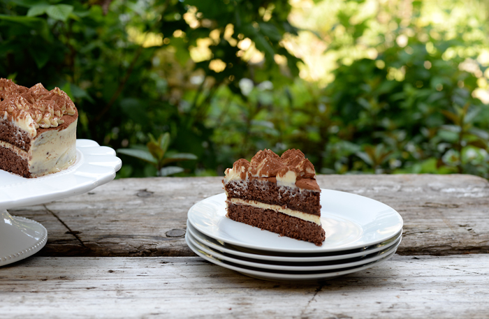 Com a ajuda do saco de pasteleiro, equipado com um bico a gosto, decorar o topo do bolo com a mistura do mascarpone e polvilhar toda a superfície do bolo com o cacau em pó peneirado.