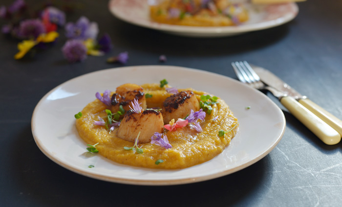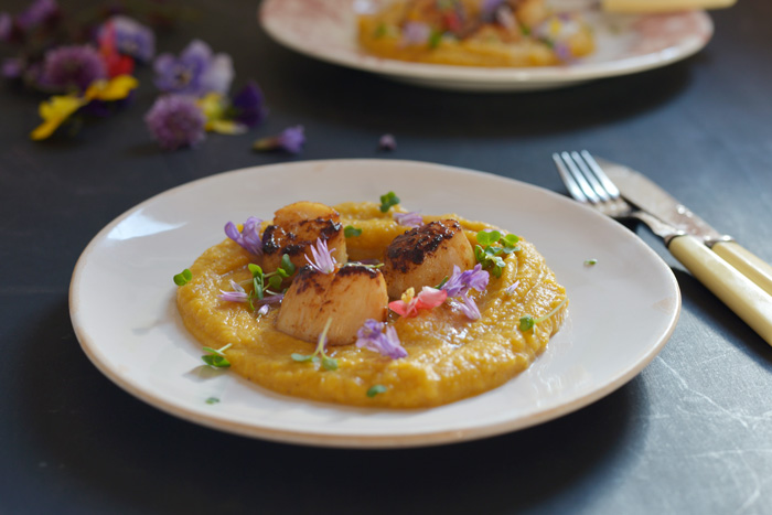 Colocar as vieiras em cima do puré, regar com o molho de yuzu, decorar com as flores e salpicar com flor de sal.