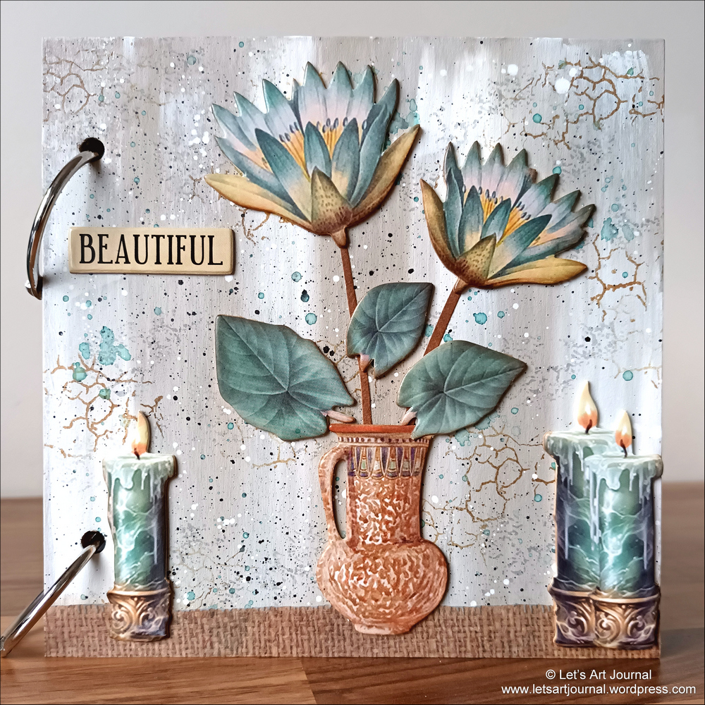 Here’s my page celebrating spring featuring: beautiful flowers and wording from a Stamperia paper pad; Distress Paint; Distress Ink; Stamperia Volume Paste; Creative Expressions Honeycomb stencil; Kuretake watercolour paints; Spectrum Noir TriBlend markers; and some bee rub-on transfers.