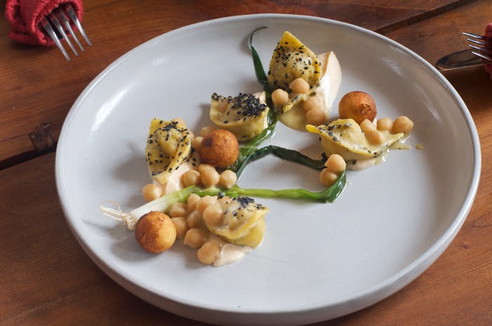 Cappellacci pasta stuffed with merguez with chickpeas, fritters and purée at Grindhaus