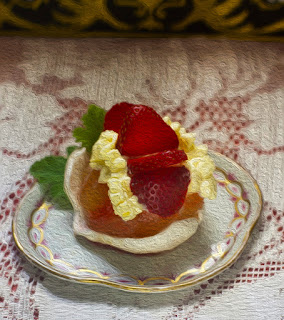 Flip the apples over so they sit on the meringue like a pillow and cover the top with whipped cream. Add sliced berries on top with a bit more of the rose jelly
