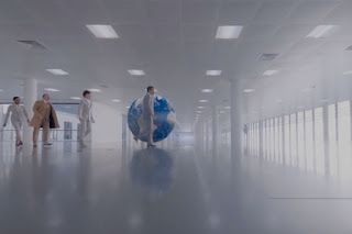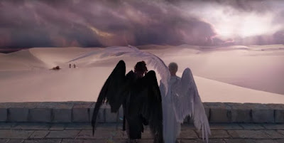 In Good Omens, Heaven is as dull as dishwater – empty whiteness, with a smug, handsome, impeccably dressed, violet-eyed angel Gabriel (John Hamm) and the halls are alive with Sound of Music because all the great composers are in’ the other place’.