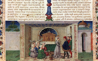 The title, decameron, means 10-day period which is the time allotted for the telling of the stories of the 3 men and 7 women escaping the black death of Florence and taking up residence in a country villa. They tell stories – 100 stories in all about real people – not just the ruling class but people from all walks of life like farmers, weavers, maids and clergy. Then as now, people loved them because the telling of the stories, the singing and dancing the carola [watch it Here ] transported the travelers from the horror of Pestilencia Magna or The Great Mortality as our streaming does for us today with Covid 19.
