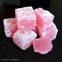 Kupnego turkish delight jeszcze nie jadłem, bo nie wiedziałem, gdzie można go kupić. Ale jak tylko napotkam, to kupię, spróbuję i porównam z tym, co sam przyrządziłem. Kupiłem natomiast wodę różaną, na bazie której chciałem przygotować moje pierwsze lokum. Nie obyło się bez problemów z jej znalezieniem. W internetowych sklepach dostać ją można bez problemu, ale jakoś nie mogę się przekonać do zakupów w sieci (i nie chodzi tu tylko o jedzenie). Produkt muszę zobaczyć na własne oczy, dotknąć, porównać z innymi. Toteż znalezienie wody różanej na sklepowej półce nie należało do najłatwiejszych. Przeszukałem większość wrocławskich delikatesów (a w akcie desperacji także drogerii), aż w końcu natrafiłem na tą niezwykle aromatyczną wodę w sklepie "Smaki świata". Kupiłem i zabrałem się do roboty. Na początek, zachowawczo, ograniczyłem się do połowy poniżej porcji, ale następnym razem zrobię z całości. Właśnie jem kawałek różanego lokum (o dziwo jeszcze zachował się) i zastanawiam się, jak opisać smak tego deseru. Jest bowiem tak specyficzny, że trudno to ująć w słowa. Po pierwsze, bardzo różany (choć wody różanej zawiera zaledwie 1 łyżkę). Po drugie, bardzo słodki (ale czego można się spodziewać po takiej ilości cukru). Konsystencja również jest zadziwiająca – ni to galaretka, ni to sztywny kisiel. Lokum to deser niezwykły i bardzo tajemniczy (tak, jak i jego nazwa), ale ja z pewnością jeszcze nie raz do niego wrócę. Jeszcze jedna istotna kwestia odnośnie do przepisu. Miarą w przypadku większości składników jest szklanka. Moja ma pojemność ok. 250 ml, ale jeśli nie macie odpowiedniej miarki (tudzież szklanki :)) to się nie przejmujcie – ważne są bowiem proporcje składników.