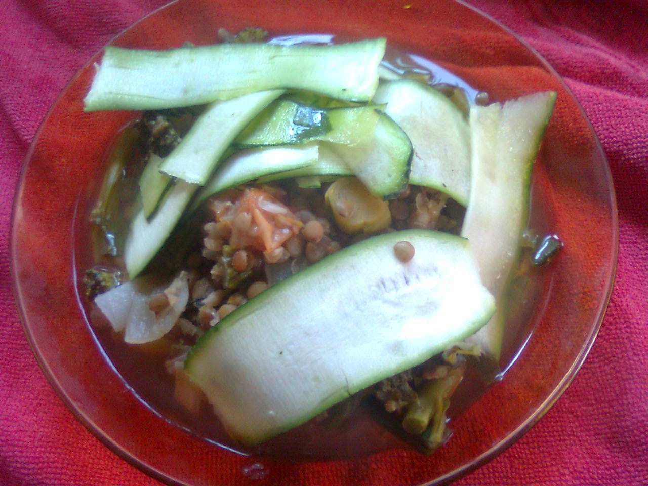 Demolhei as lentilhas durante a manhã. Lavei-as e pus-as a cozer em água e sal. Juntei alho, cebola, alho francês, tomate e brócolo. Entretanto com um descascador de batata, laminei uma courgette para uma taça e temperei com azeite e vinagre de cidra.