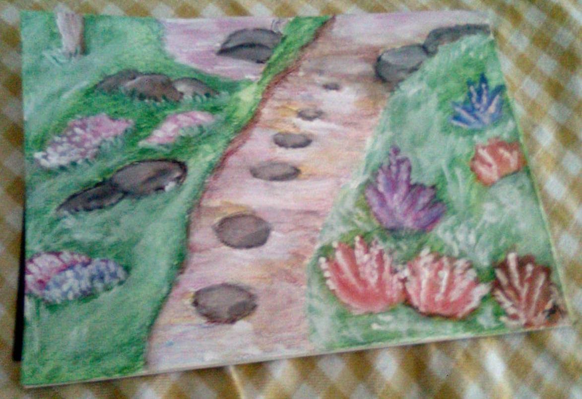 Mais uma pintura a imitar arte vitral. Foi pintada a aguarela e as linhas foram feitas a caneta preta.