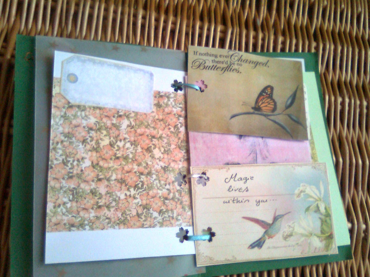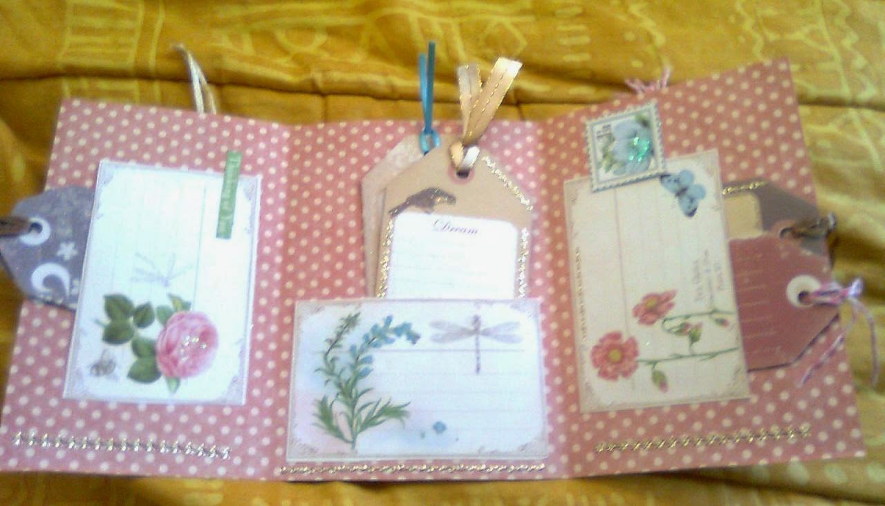 Com cartões pre-cortados com janelinhas, fiz a capa do fairy album (album de fadas). Decorei com flores de papel e usei caneta gel metálica dourada para desenhar os motivos com os ramos...