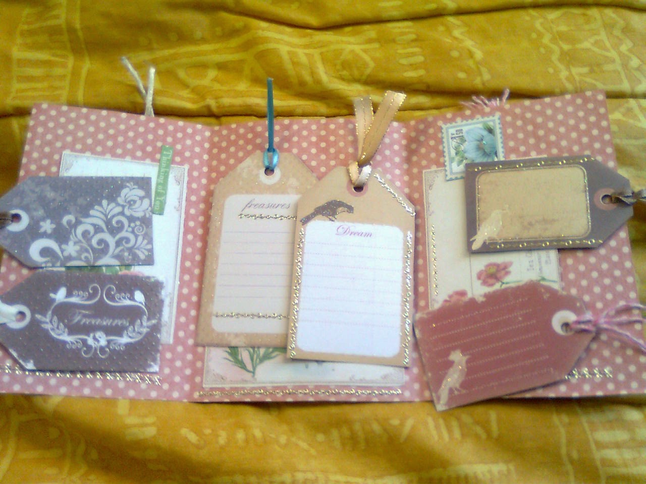 Tinha um album de papeis decorativos e uma página com etiquetas por recortar. Recortei-as e decorei-as com autocolantes dourados. Furei-as e passei fita decorativa.