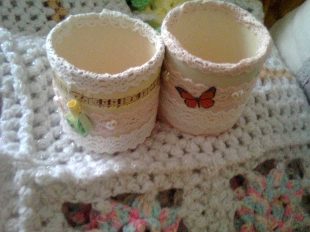 Para finalizar colei uma tira de renda à volta da tampa com cola branca.