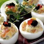 Colocamos la mezcla en una manga pastelera y vamos poniendo sobre cada mitad del huevo, en el espacio que antes ocupaba la yema. Encima de todo se pone un poco de sucedáno de caviar.
