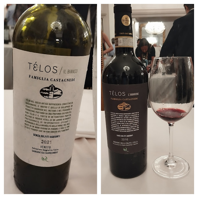 “TÉLOS Il Bianco” 2021, senza solfiti aggiunti, Chardonnay e Garganega, lieviti indigeni. Profumo di agrumi e mango, poi erbe aromatiche; morbido, piacevole, salino.