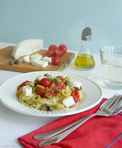 Luk sitno iseckati, plavi patlidzan i tikvicu oprati i iseckati na kockice (ako je kora tvrdja možete i oljuštiti), paradajz prepoloviti. Sve staviti u vatrostalnu posudu, dodati ne očišćen beli luk, preliti maslinovim uljem i posuti sa suvim začinima pa posoliti i pobiberiti. Pokvasiti parče papira za pečenje pa prekriti povrće i peći na 200 stepeni 20 minuta, zatim skloniti papir i pojačati rernu na 220 i peći još 15-20 minuta. Skuvati špagete, vodeći računa da budu gotove u približno isto vreme kada i povrće. Podeliti testeninu na tanjire, dodati povrće i sok koji je preostao od pečenja, istisnuti iz opni beli luk malo ga usitniti pa ga raporediti. Po potrebi sve preliti sa još ulja, dodati soli i bibera. Sve nežno promešati, staviti preko testenine masline naseckane na kolutove, kapare i kockice sira. Poslužiti odmah.