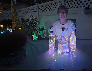 So I'm still celebrating my birthday Saturday!!! This time was a lovely BBQ supper with Angela and Bruce. She made bruchetta, BBQd lamb roast, stuffed zucchini boats and served with her yummy potato salad. I was stuffed and could not have a second helping, my usual with her scrumptious meals! We finished off later on with graham cracker base (I think) lemon meringue pie (my favourite) and coffee! Definitely stuffed plus take home too, even with mint jelly! Her garden and patio is beautiful in daylight and in the evening too!