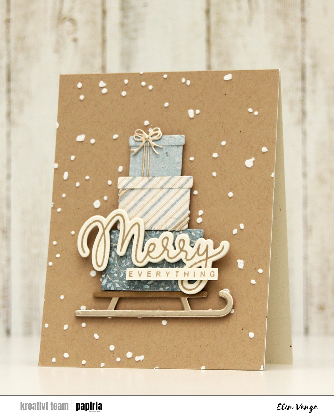 Speaking of backgrounds – I used one of the stencils in the Splatter Textures stencil set from Kristina Werner on a panel of Wheat cardstock from Concord & 9th. I added Altenew embossing paste through the openings and sprinkled on rock candy distress glitter while the paste was still wet. It’s important to clean your stencils quickly when using paste, or you’ll have a really hard time making it come off. Nobody wants to clean, but when dealing with pastes, you need to. I stamped my sentiment from the Joyful and merry stamp set from Kristina Werner using Wheat ink on Rustic Cream cardstock from Papertrey Ink. I used the coordinating die set to cut out my merry, and added another three die cuts on the back for dimension. I cut down everything to a nice strip, added another strip on the back for strength and adhered the sentiment to the largest present to finish the card.