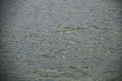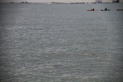 We first saw a large pinkish-brown animal with a large strong tail moved just about 25m in front of us. We shouted "Dugong!" and fumbled for our cameras. By that time, the dugong sank into the water and we could not see it any more. There were large ripples around. Half a minute later, it surfaced again, and its large body and tail still visible. We could tell the animal does not have a dorsal fin. It was slow-moving, certainly not traveling fast in the water. It disappeared from sight after a few seconds. All of us hung around hoping for another glimpse of the elusive animal. And it came back, 8 minutes later (according to the timestamp on our photos), and at a location further to the right. Here are the photos contributed by Leykun and Ian.