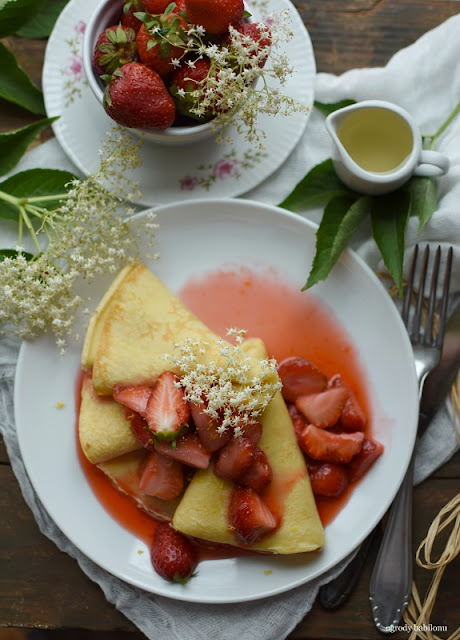 Delikatne i bardzo cienkie naleśniki podane z karmelizowanymi truskawkami aromatyzowanymi syropem z kwiatów czarnego bzu. Naleśniki z truskawkami i syropem z kwiatów czarnego bzu, zasmakują każdemu, są idealne na letni podwieczorek.