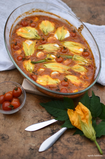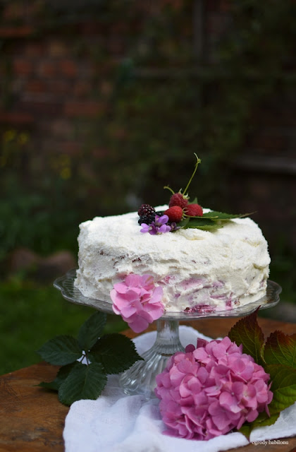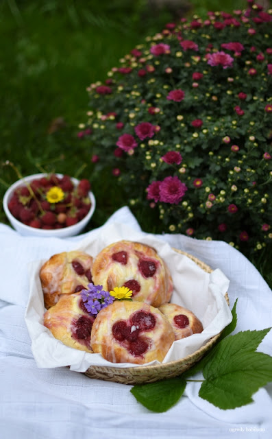Do garnka włożyć owoce, zasypać cukrem i całość zagotować. Manty podawać ze śmietaną i sosem malinowym.