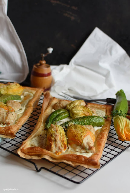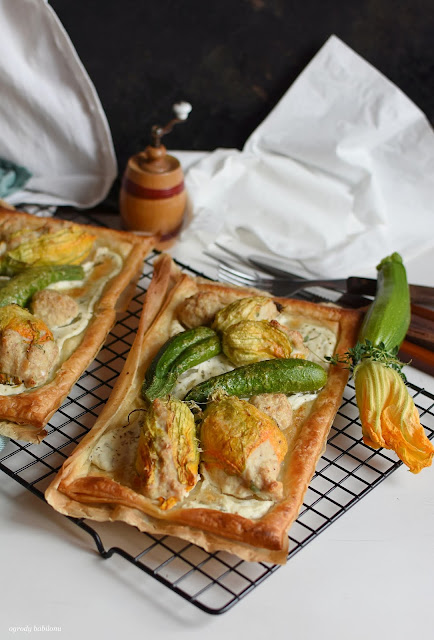 Kwiaty cukinii nadziane masą z mielonego indyka z dodatkiem ziół, czosnku i cebuli zapieczone na francuskim cieście z dodatkiem kremowego nadzienia. Tarty z kwiatami cukinii nadziewanymi indykiem, to wspaniała potrawa, pysznie smakuje podane w towarzystwie schłodzonego wina.