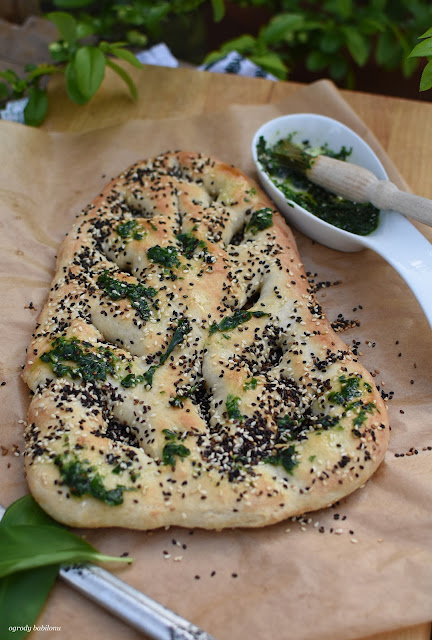 Wierzch posmarować oliwą i posypać sezamem. Piekarnik rozgrzać do temperatury 230º C i piec 13 minut, aż fougasse będą rumiane. Po upieczeniu posmarować masłem z czosnkiem niedźwiedzim.